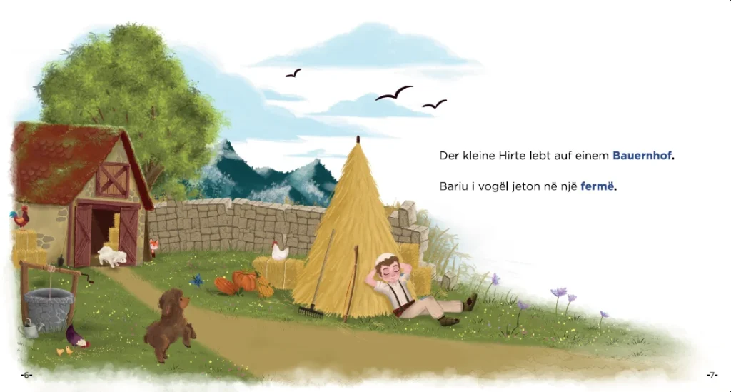 Am Ende des Märchens findet sich ein Glossar, das Wortpaare wie «Bauernhof – fermë» gegenüberstellt. In Zusammenarbeit mit zwei erfahrenen Dozierenden der PHZH entwickelt, eignen sich unsere Bücher auch als Zusatzmaterial für Deutsch als Zweitsprache (DaZ) oder den HSK-Unterricht – inklusive praxisnaher Lernkontrolle.